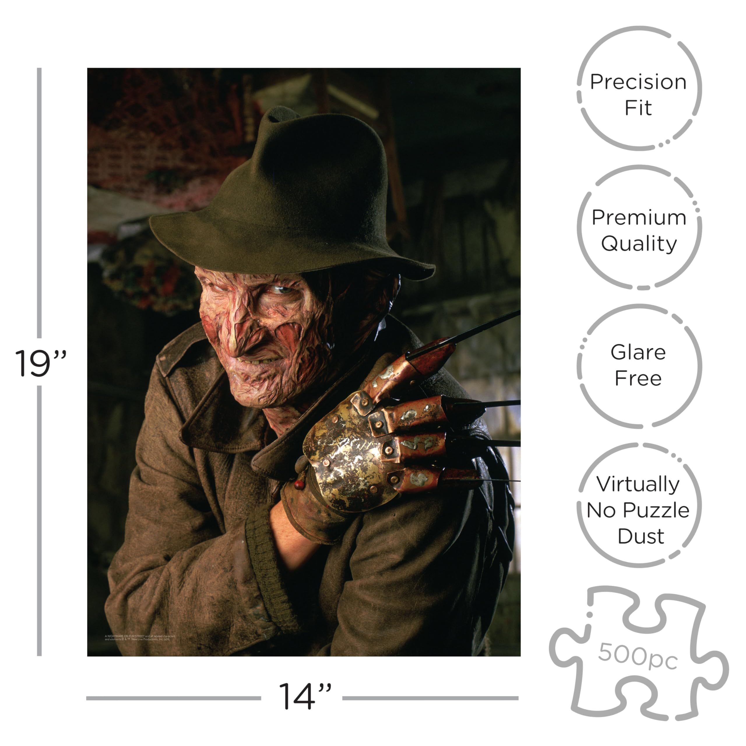 - A NIGHTMARE ON ELM STREET MOVIE 500 PIECE JIGSAW PUZZLE: Enjoy piecing together this 500 piece puzzle featuring imagery from A Nightmare on Elm Street . It measure 14 x 19 when completed and comes in a coffin shaped box with a bonus poster of the image