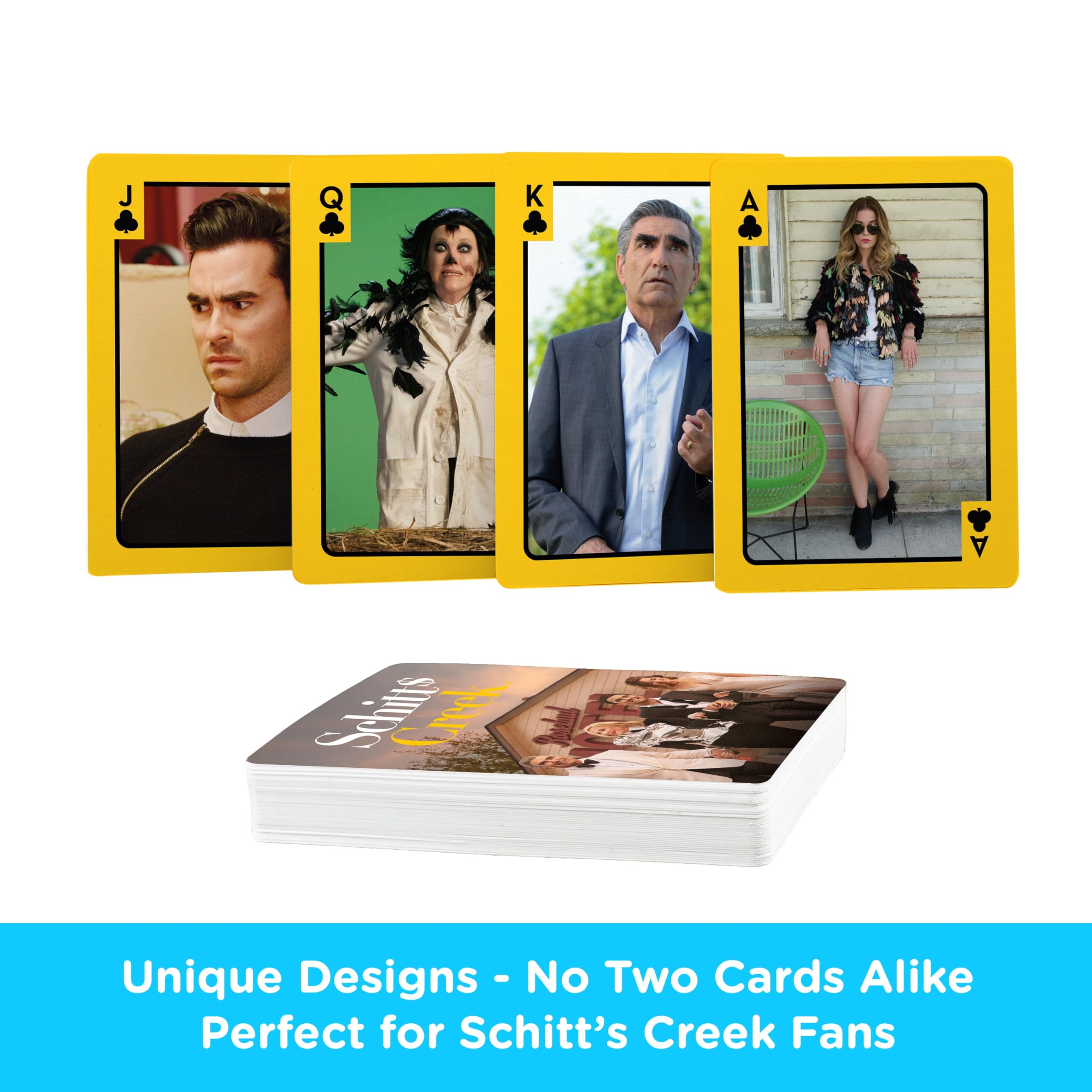 INCLUDES: 52 high-quality playing cards, plus 2 jokers. Every single playing card features its own distinct Schitt's Creek themed design and art. No two cards are alike.